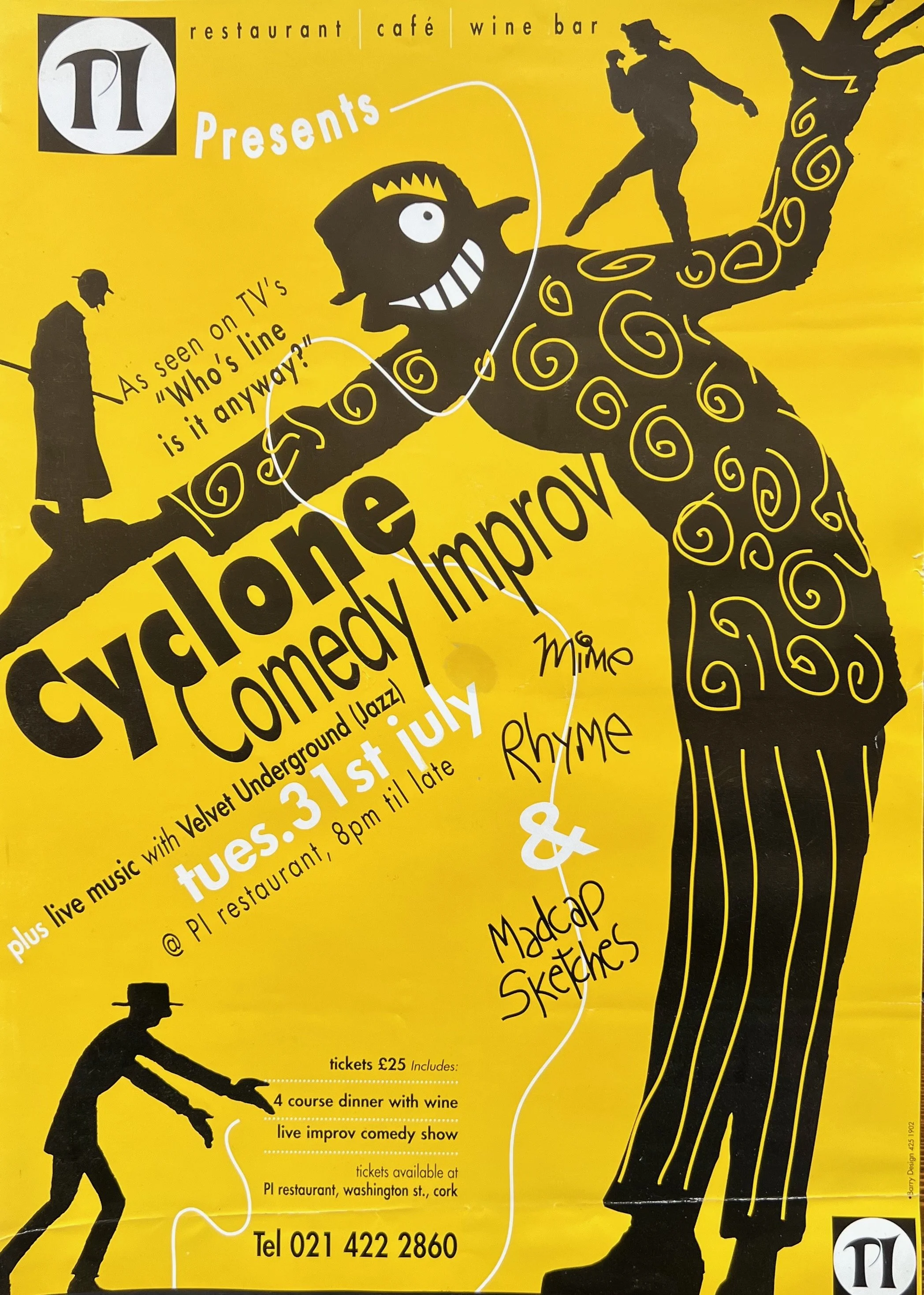 Cyclone Improv was Cork’s first improvisational comedy troupe. Featuring Ger Barry, Donal Courtney, Peadar Donohoe and future Cyclone Rep Company Manager Marcus Bale. During its tenure Cyclone Improv premiered at the Cork Arts Theatre to appreciative audiences and toured to various venues in the Munster region. Unfortunately and fortunately, Peadar has to disband the Improv Troupe as demands of parenthood were prioritised.